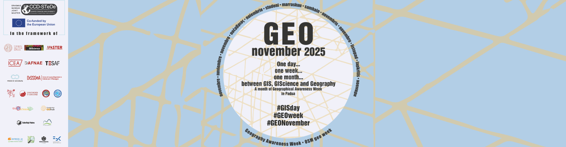 This year, the Erasmus Mundus International Joint Master on Climate Change and Diversity: Sustainable Territorial Development (CCD–STeDe) is pleased to announce a series of events — both online and in presence — organized within the framework of the 8th edition of the GeoNovember initiative, in collaboration with the Master in GIScience and Remote Piloted Systems of the University of Padova.